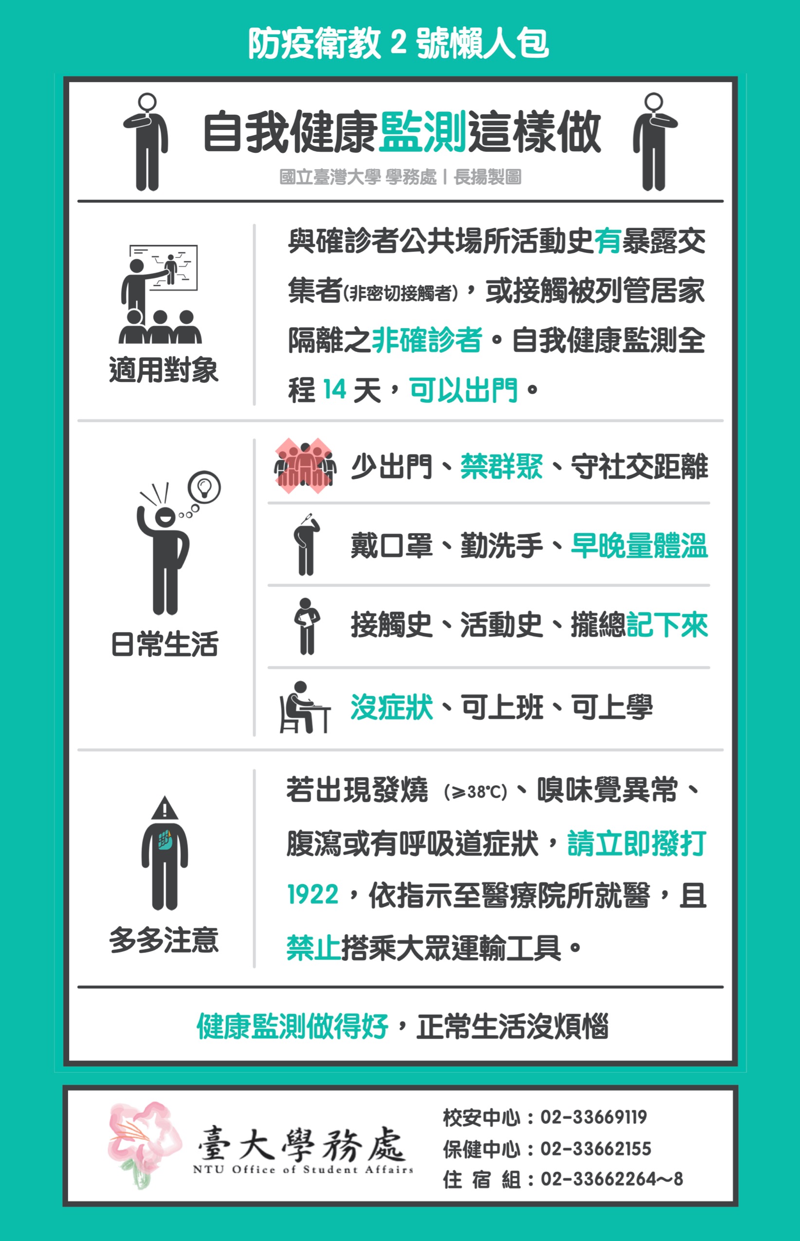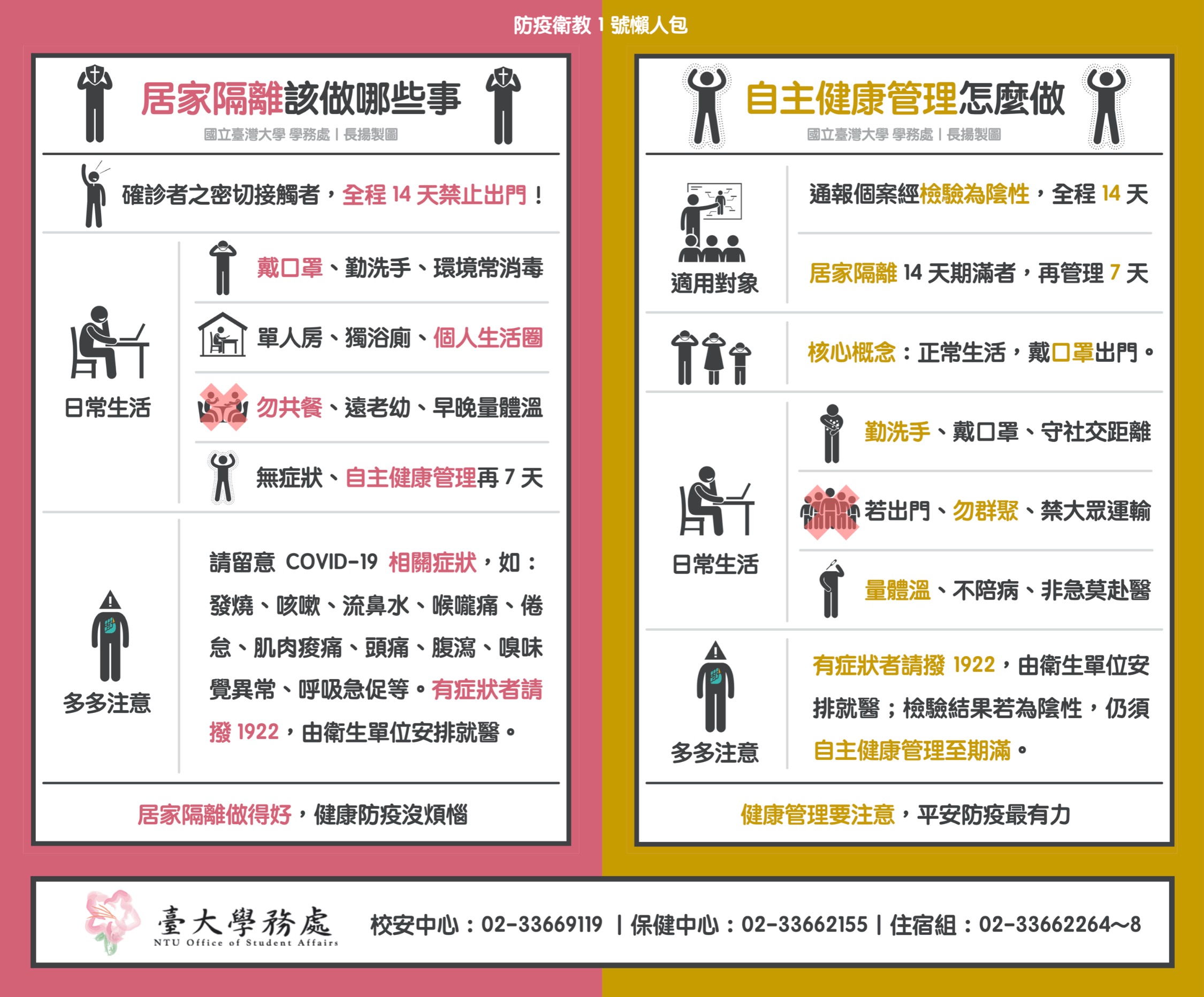 學務處特製「居家隔離」、「自主健康管理」、「自我健康監測」防疫衛教懶人包,請見下圖: